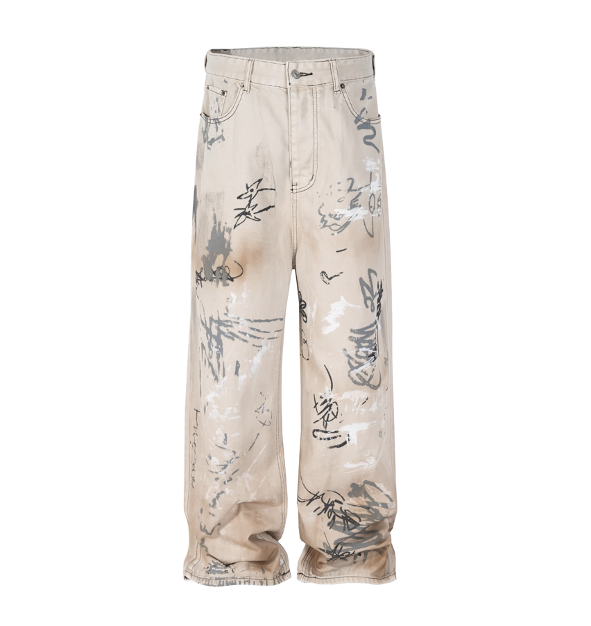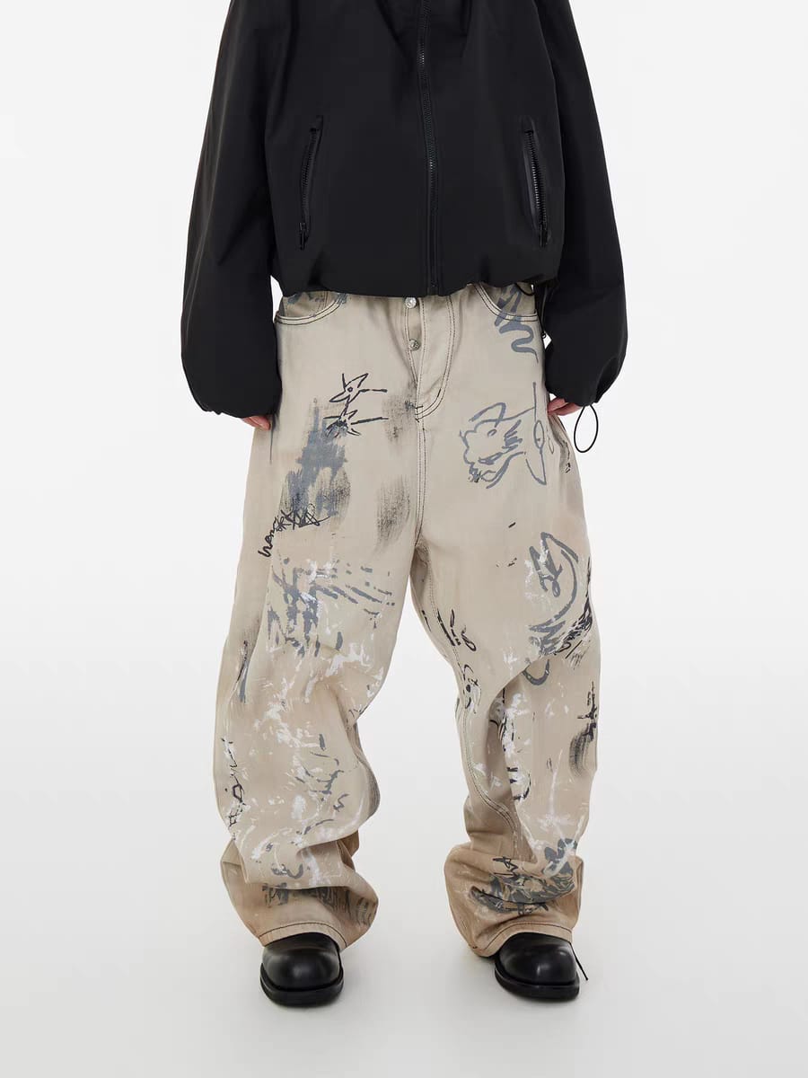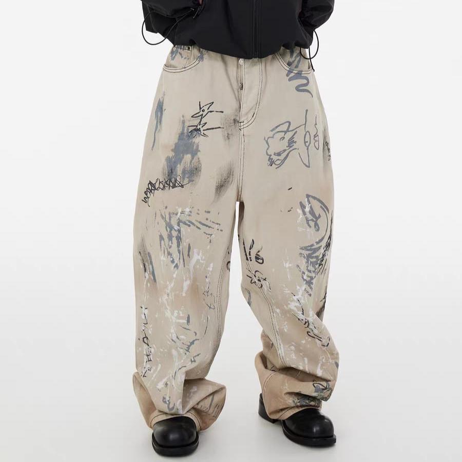 C&C EL BOYAMASI GRAFFİTİ TASARIMLI BOL KESİM PANTOLON